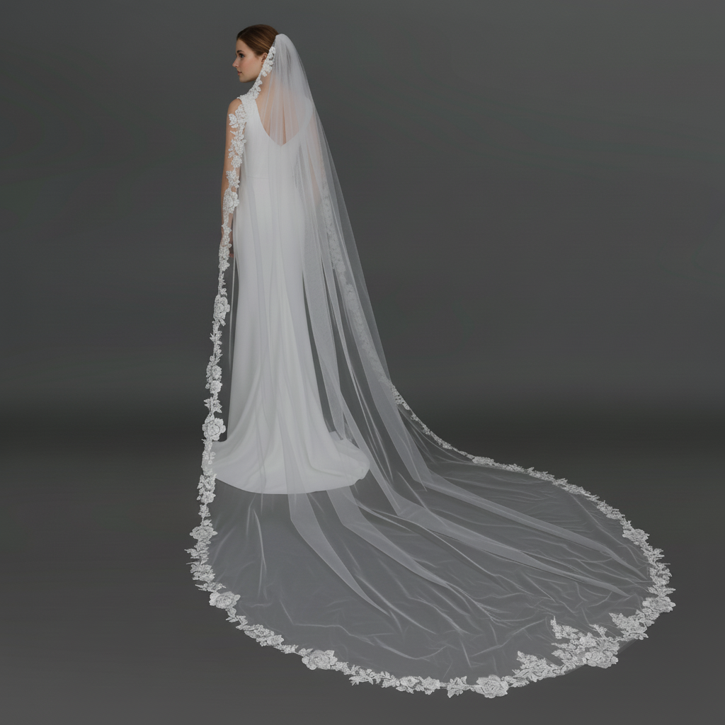 Floral Lace Cathedral Wedding Veil with Rhinestoney, Fine Illusion Tulle