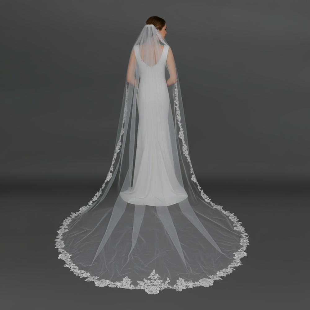 Angel Cut Bridal Veil with Floral Vine Embroidery, Fine Illusion Tulle, Cathedral Length FS6221-AC