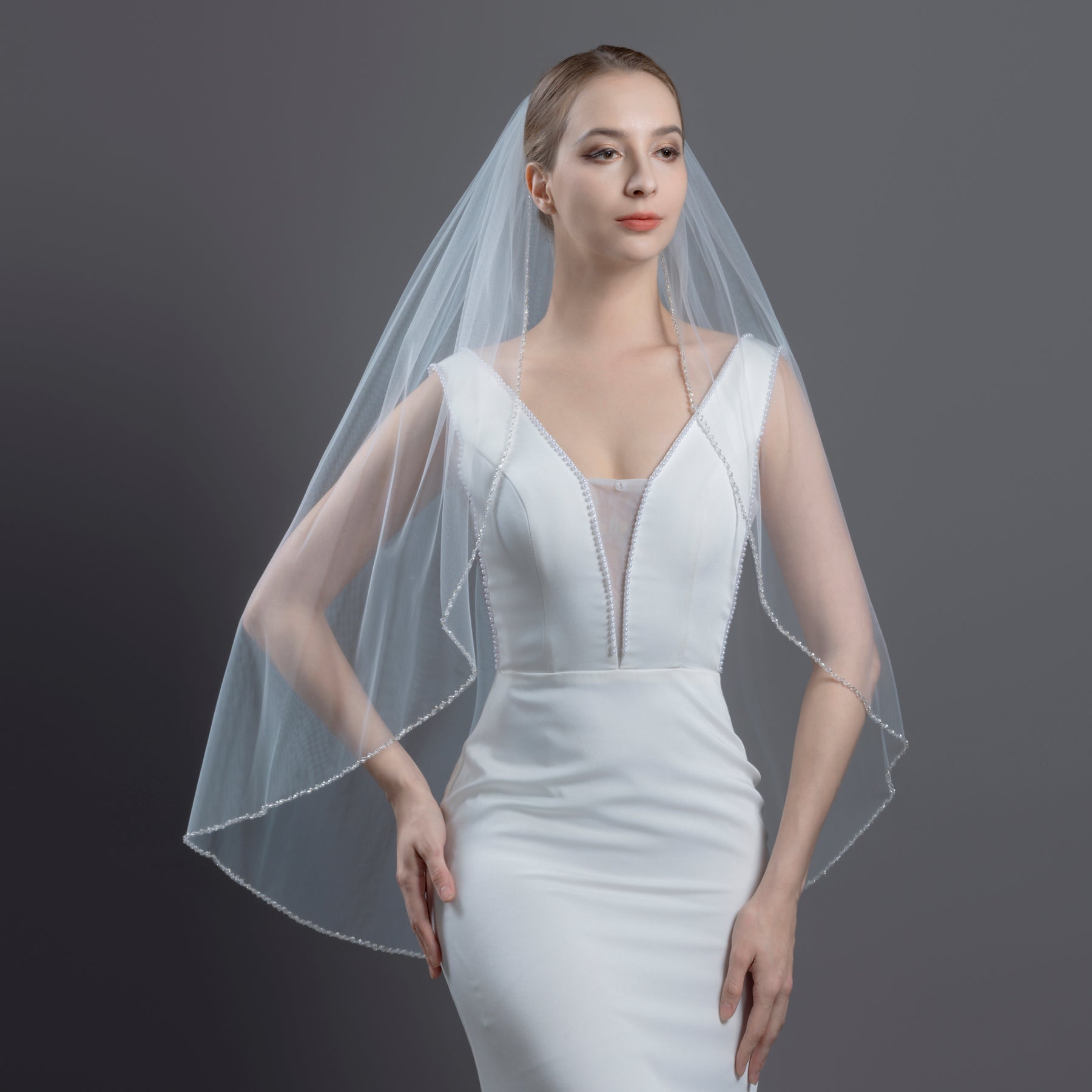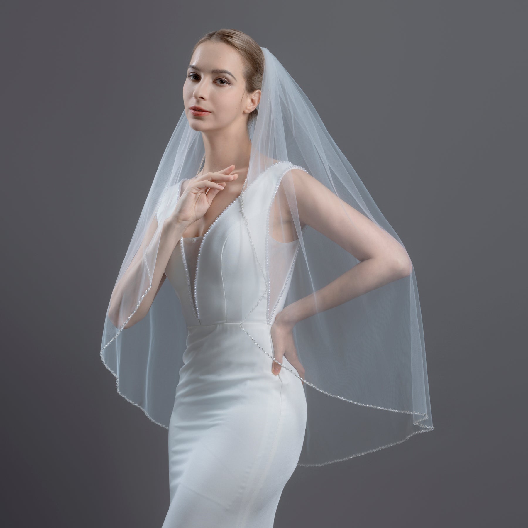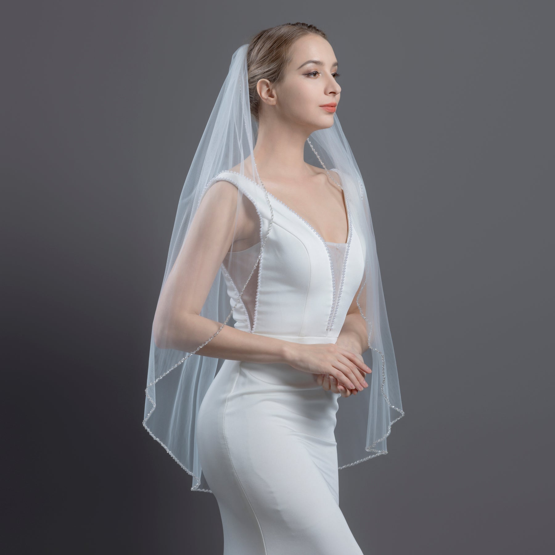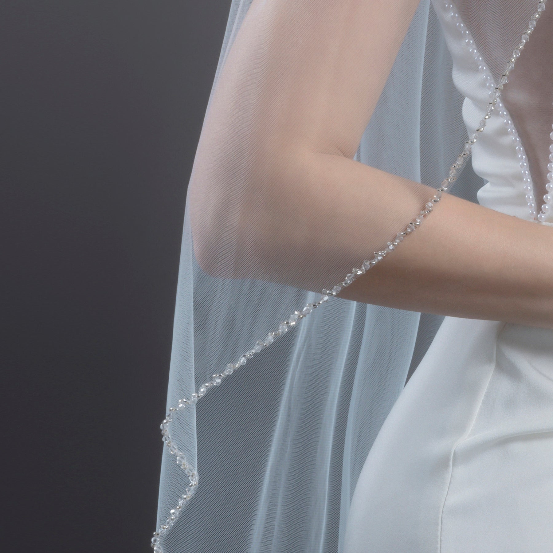 Source this elegant beaded edge bridal veil featuring bicone crystal embellishments for your boutique. This stylish fingertip length bridal veil is crafted from fine illusion tulle and is adorned with silver-lined seed and bugle beads. As a one-tier wedding veil with a 72" width, it offers a refined and graceful drape. An essential wholesale wedding veil piece, it includes a premium flexible tulle-wrapped metal wire comb.