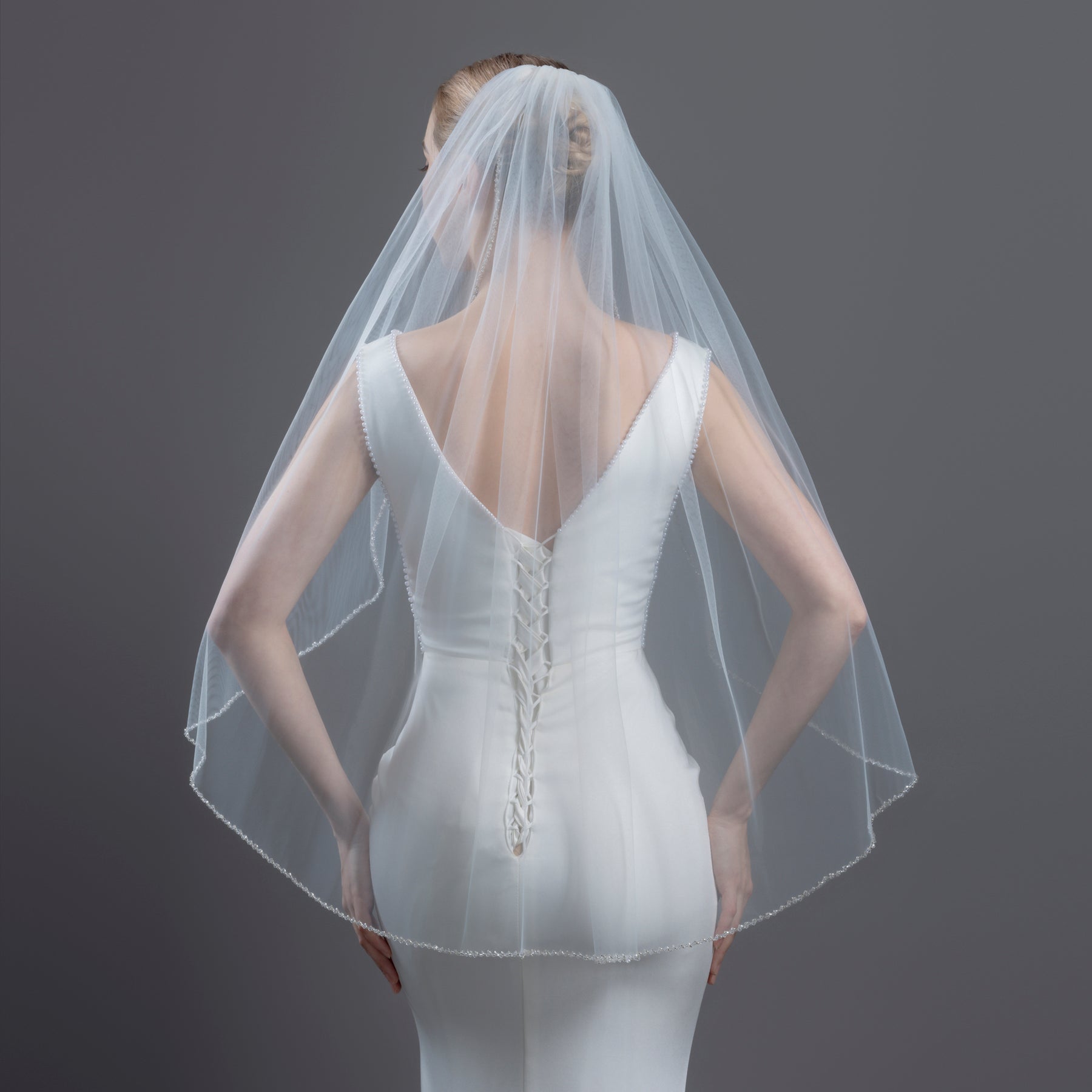 - One tier, fine illusion tulle - Beaded edge design with bicone crystal, silver-lined seed beads, and silver-lined bugle beads - Fingertip length 36" - 72" width for a refined and elegant drape - Premium flexible tulle-wrapped metal wire comb
