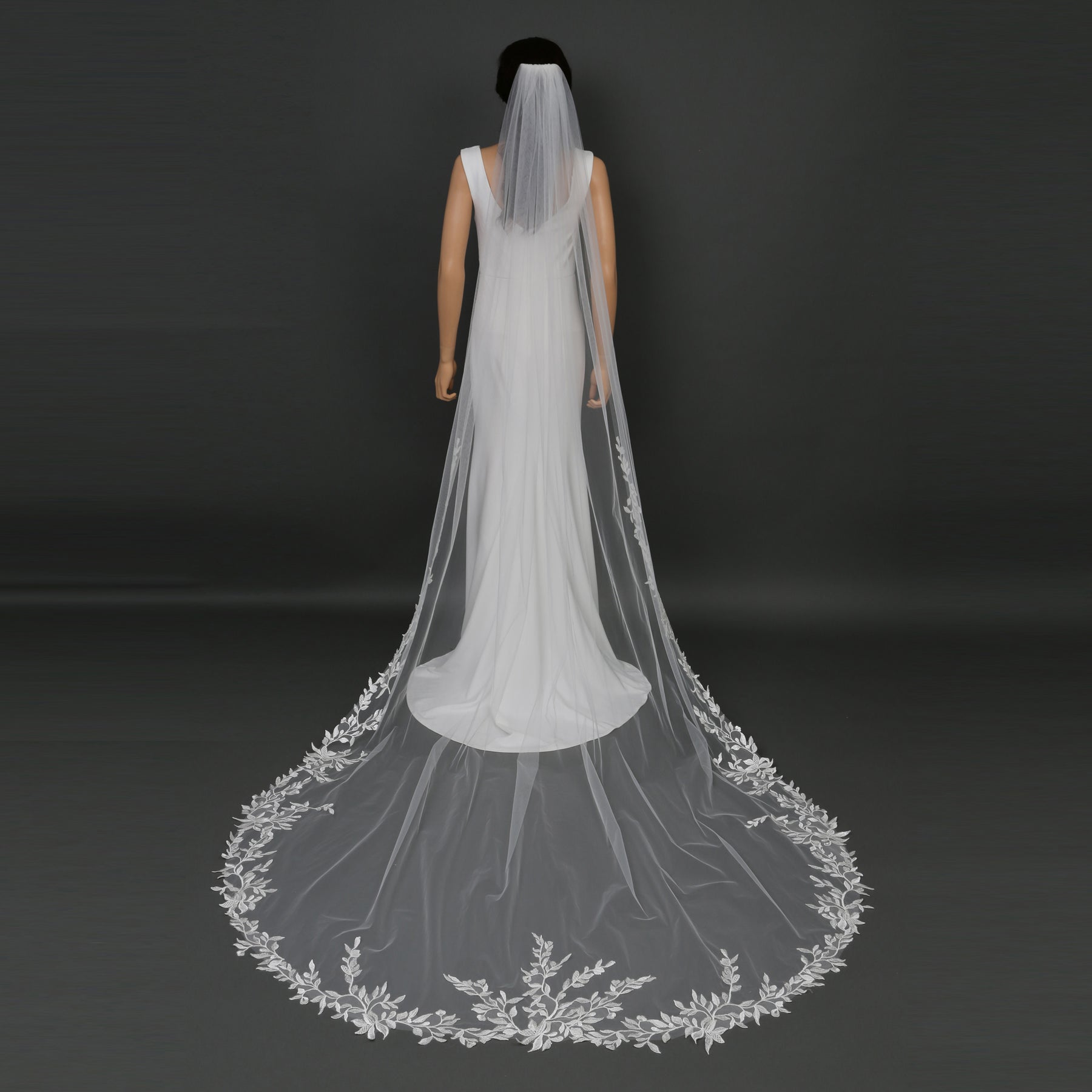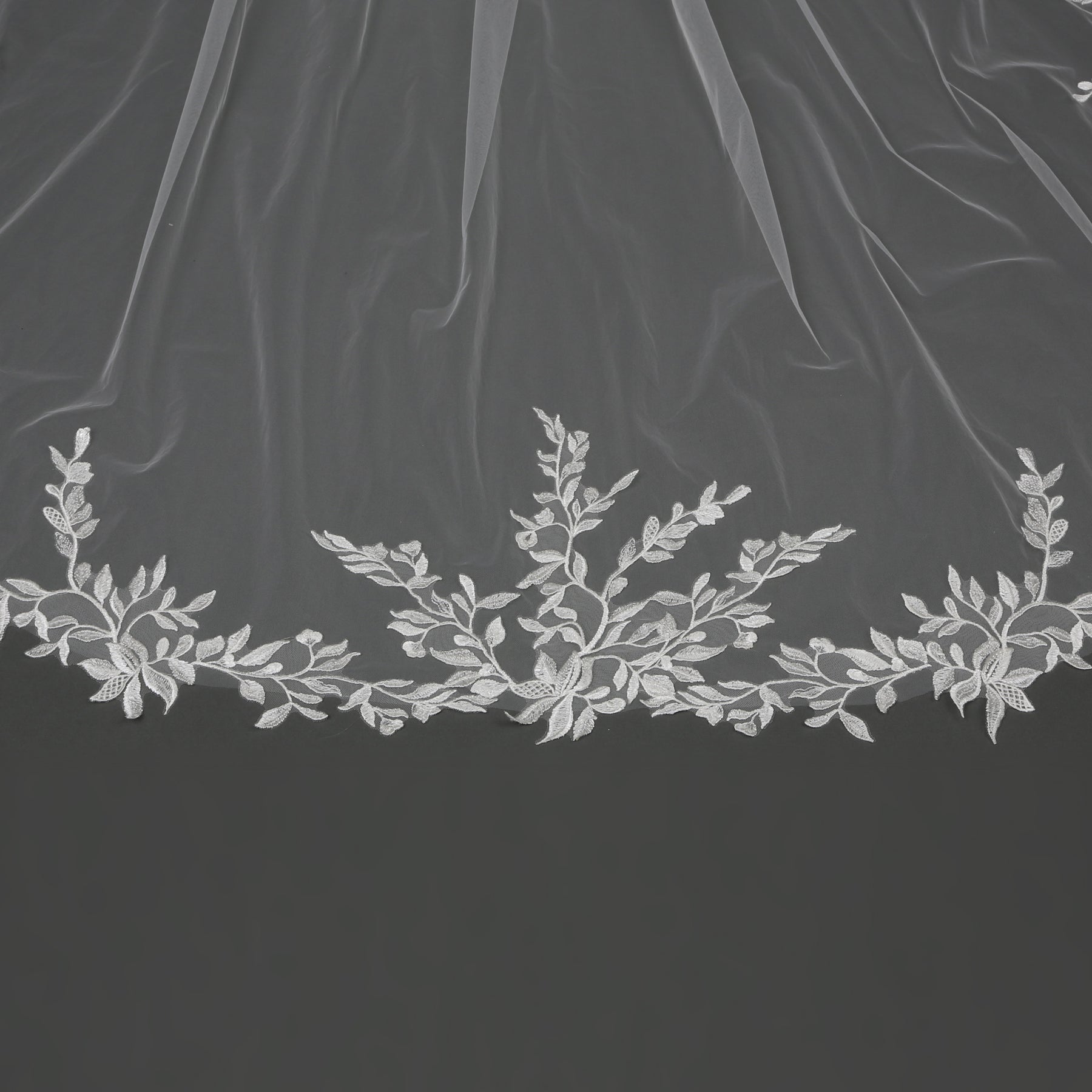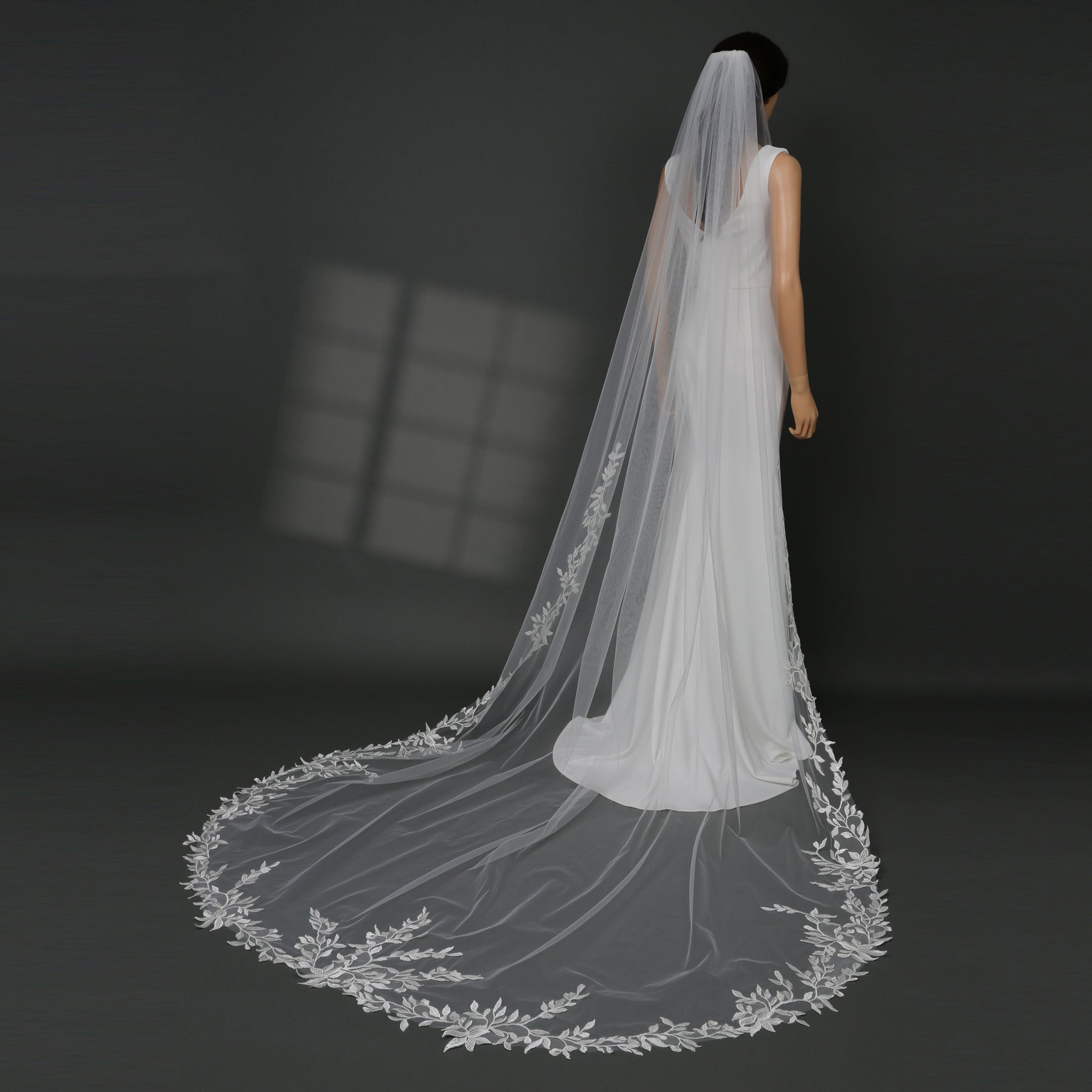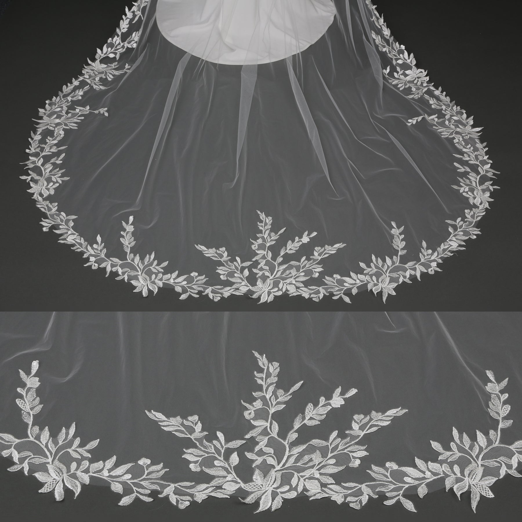 Source this exquisite bridal veil adorned with floral vine embroidery and sequins for your boutique. This popular cathedral length bridal veil 108" is crafted from delicate illusion tulle and offers a captivating design. As a one-tier wedding veil with a 72" width, it creates a beautifully refined silhouette. An essential wholesale wedding veil piece, it includes a premium flexible tulle-wrapped metal wire comb.