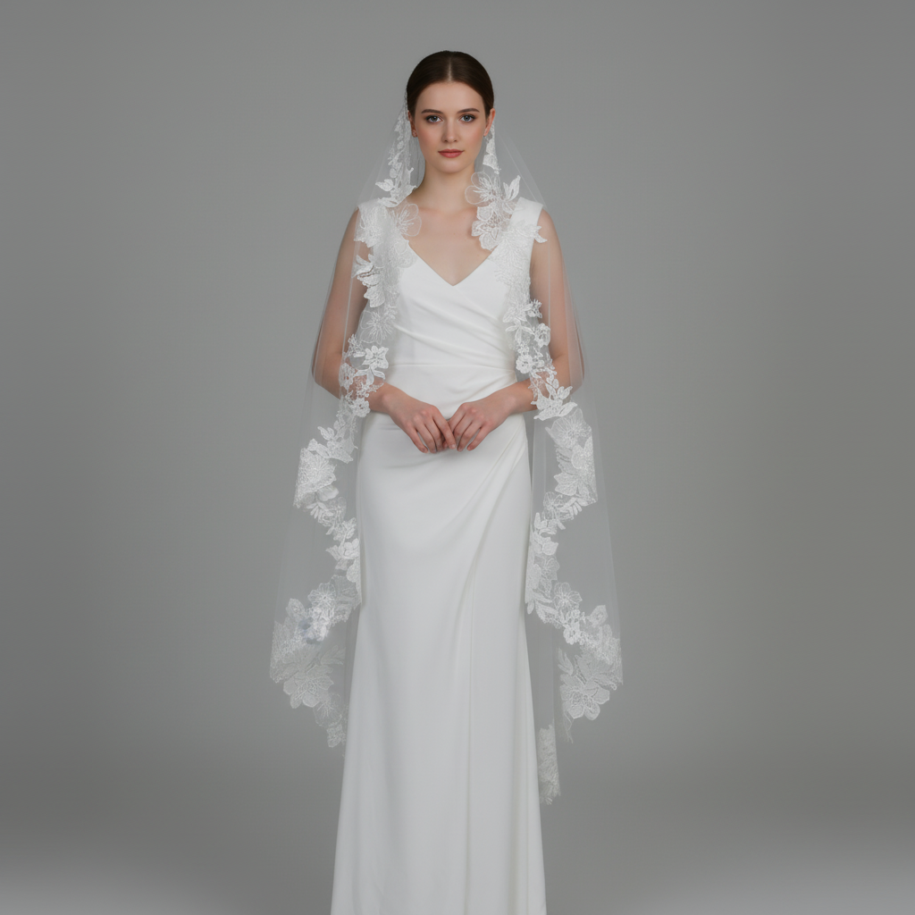 Mantilla Style Bridal Veil with Rhinestones Lace, Fine Illusion Tulle, Waltz Length FS6305-M