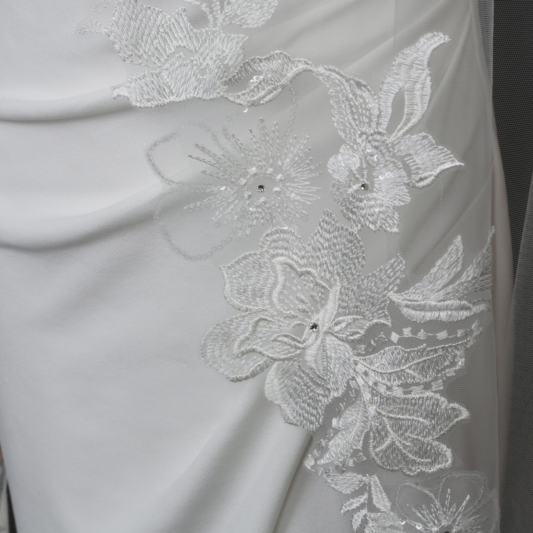 - One tier, fine illusion tulle - Embroidered floral vine lace with rhinestone and sequin decoration - Cathedral length 108" - 72" width for a refined and elegant drape - Premium flexible metal comb wrapped in matching tulle