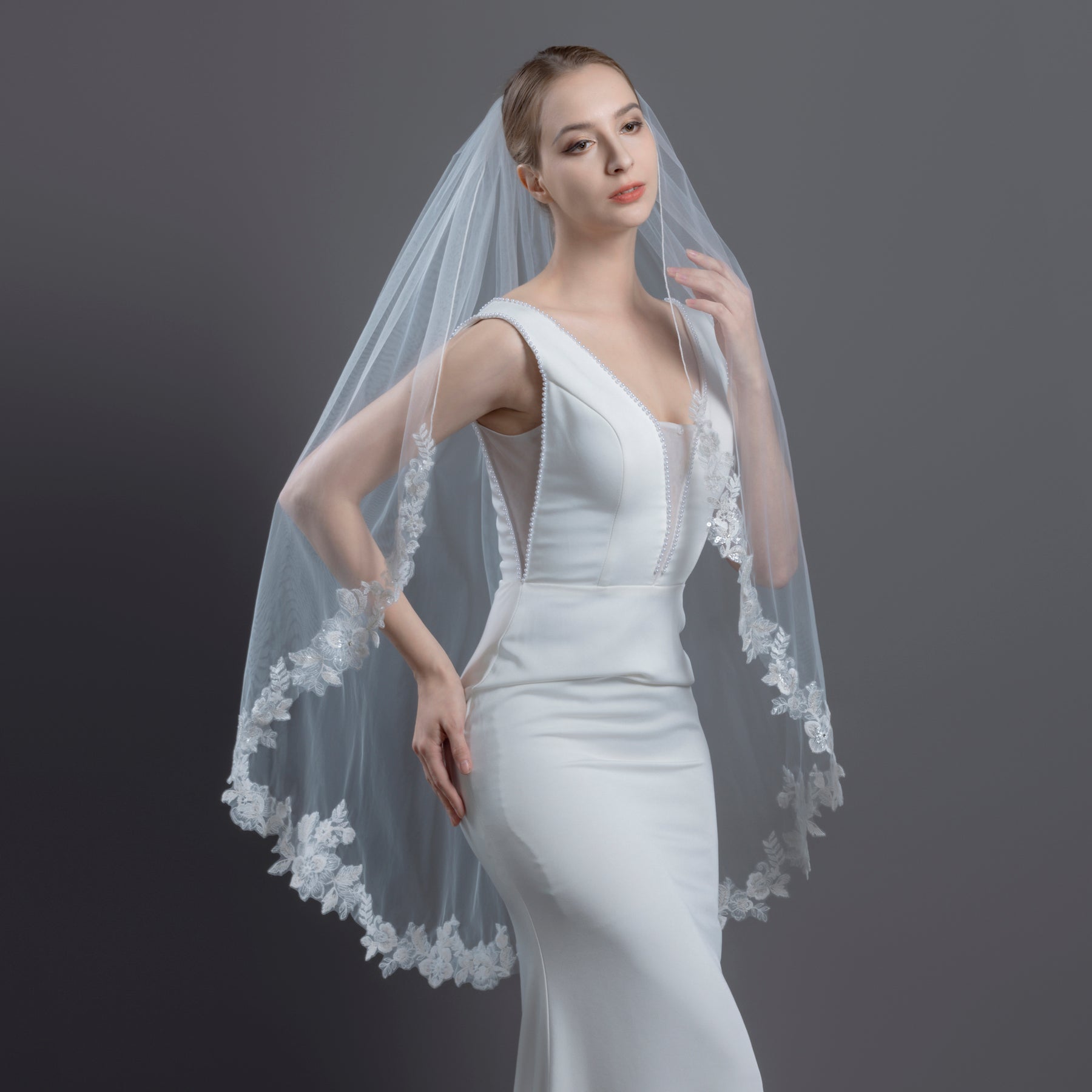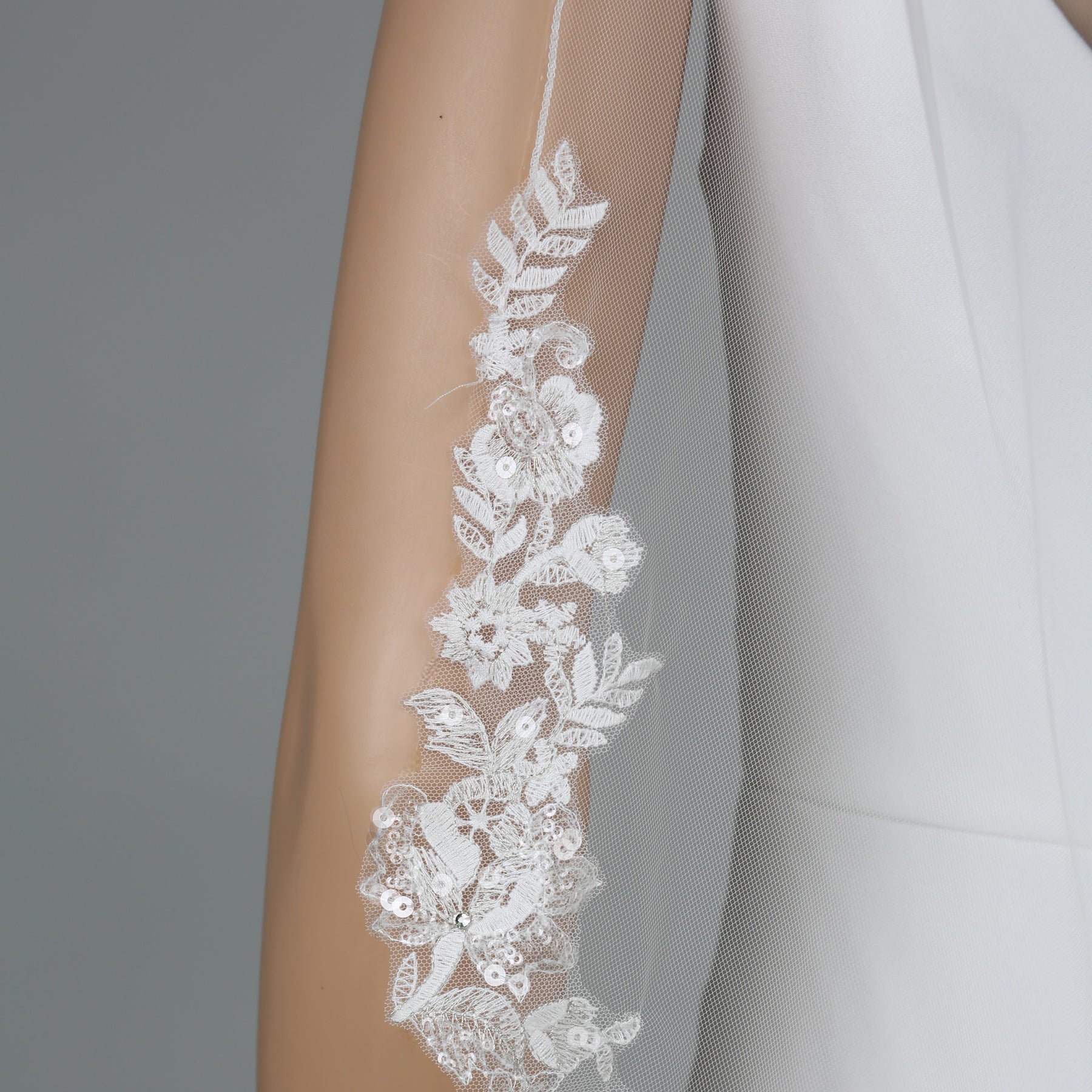 - One tier, soft tulle - Floral vine embroidered lace with rhinestones and sequins - 42" fingertip or knee length - 60" width for a refined and elegant drape - Premium metal comb wrapped in matching tulle
