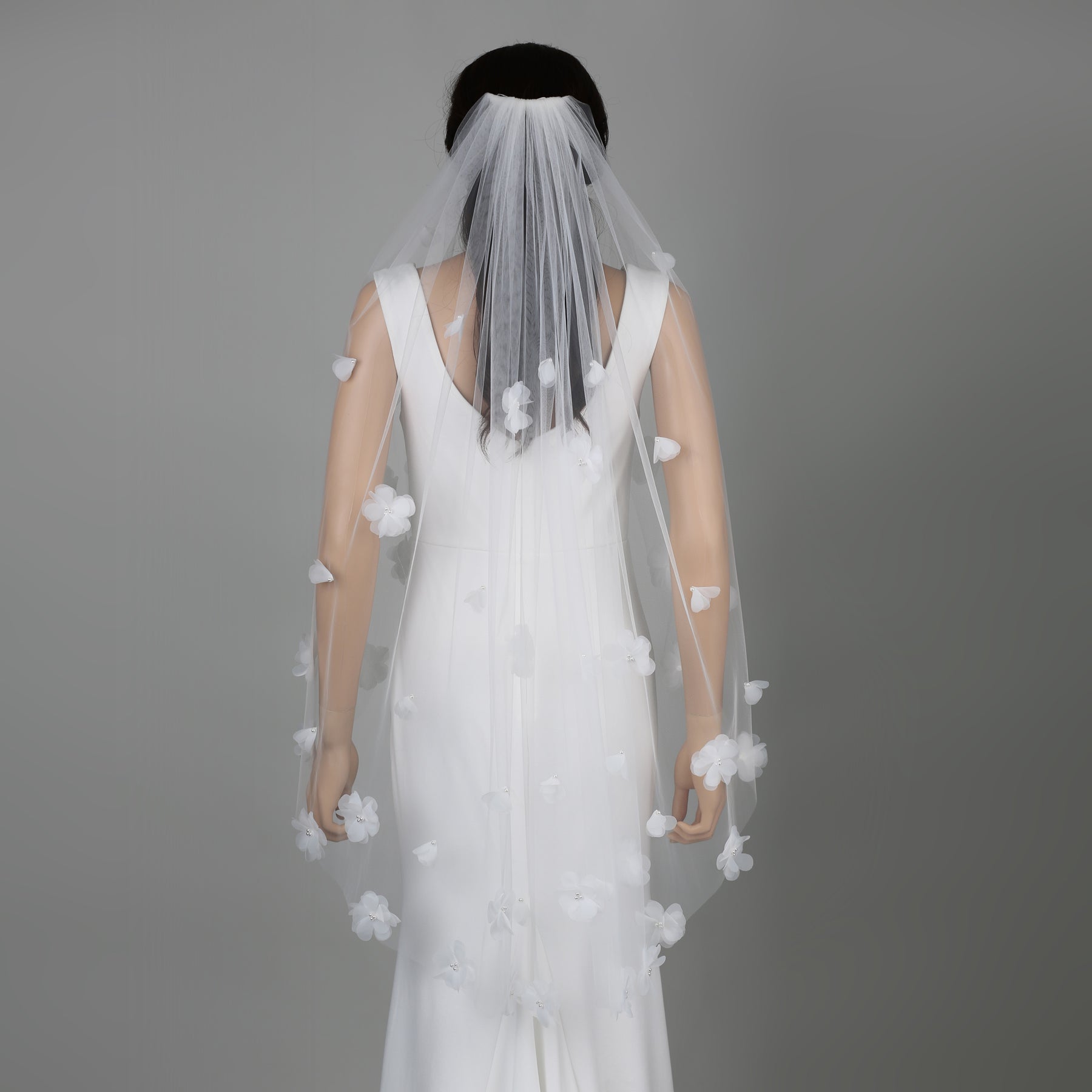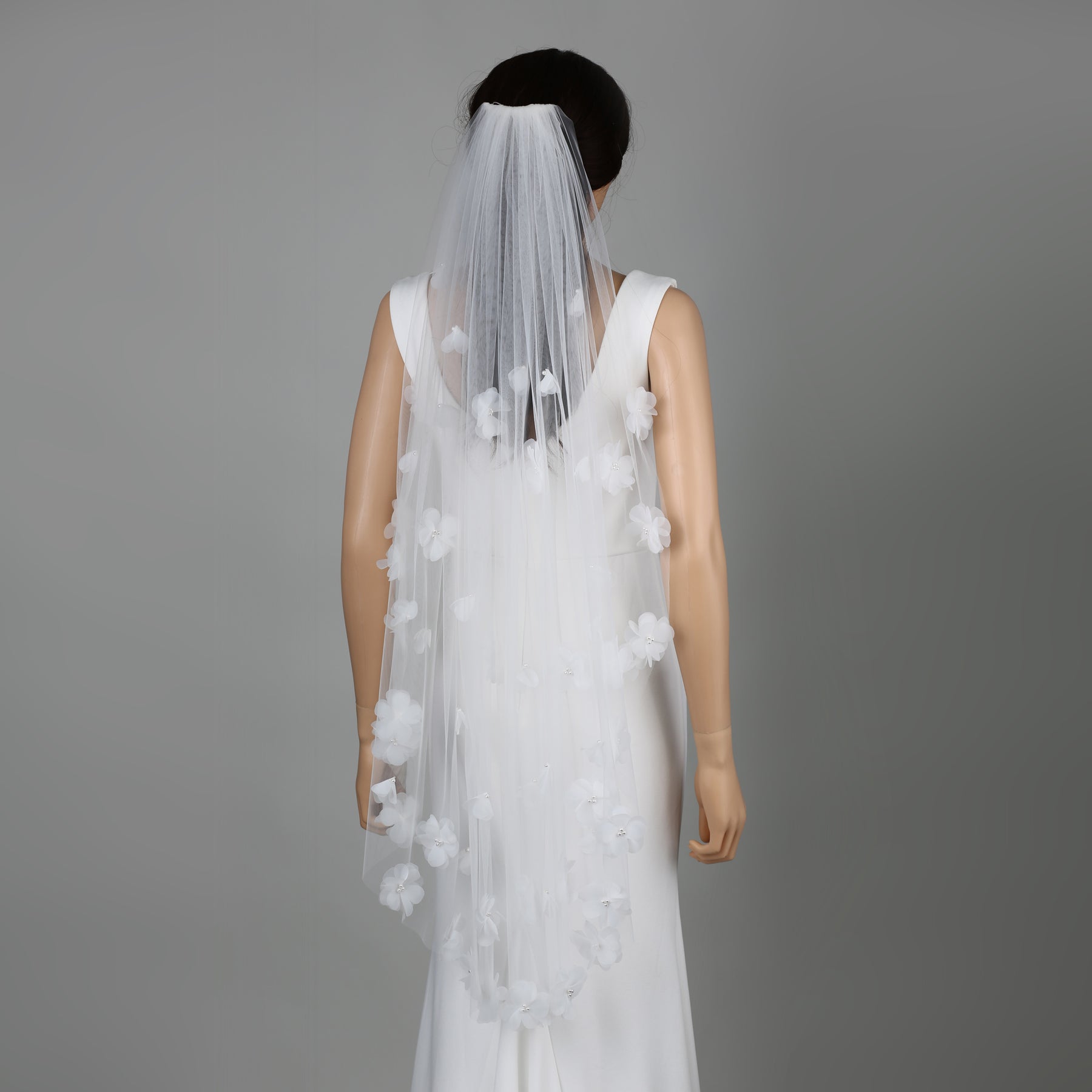 Source this stunning bridal veil adorned with scattered 3D organza flowers and faux pearl accents for your boutique. This versatile 42" length bridal veil is crafted from fine illusion tulle, perfect for creating a delicate and enchanting look. As a one-tier wedding veil, it offers a graceful and sophisticated finish. An essential wholesale wedding piece, it includes a premium flexible tulle-wrapped metal comb.