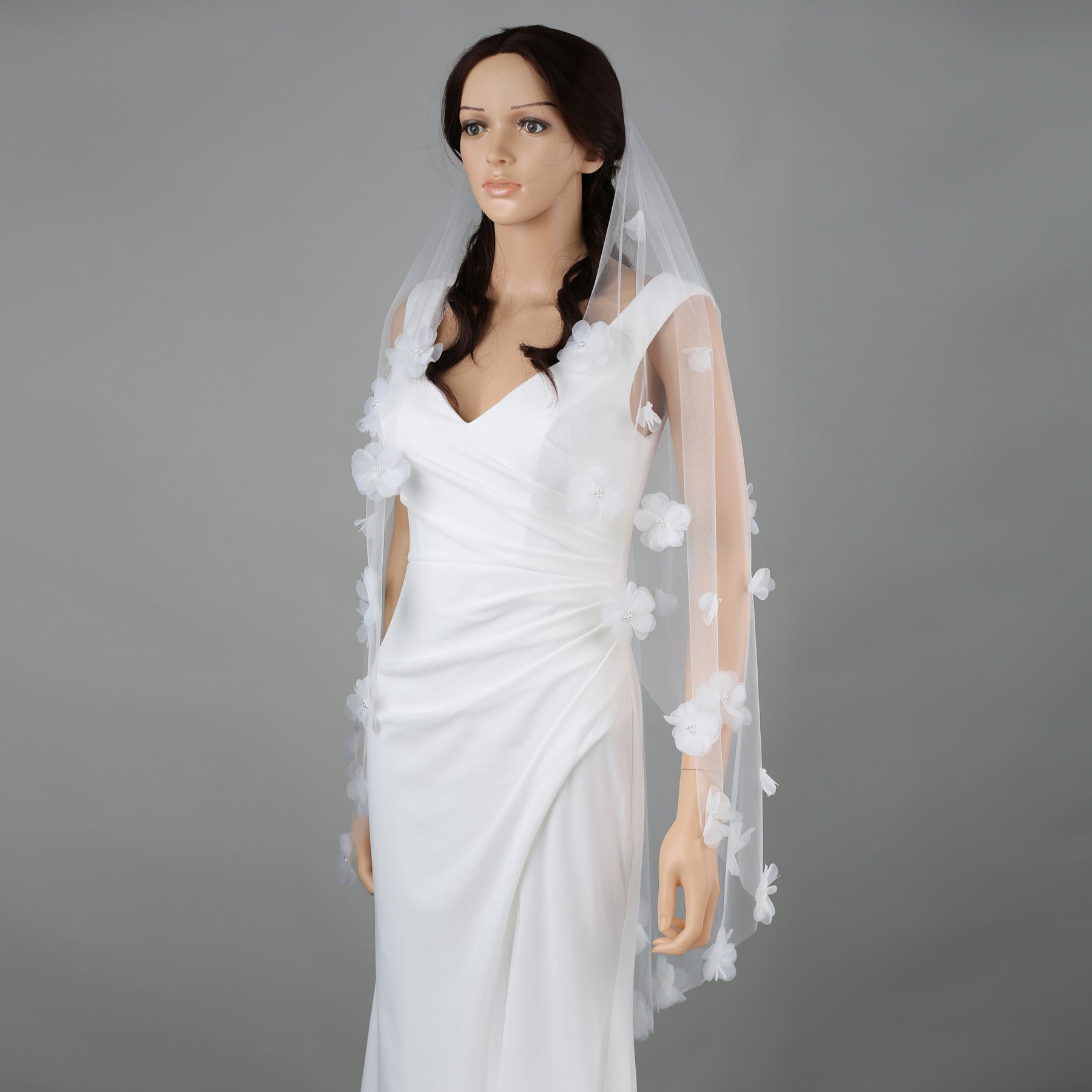 Organza 3D Flower Bridal Veil with Faux Pearls, Fine Illusion Tulle, Fingertip, Knee Length FS6234