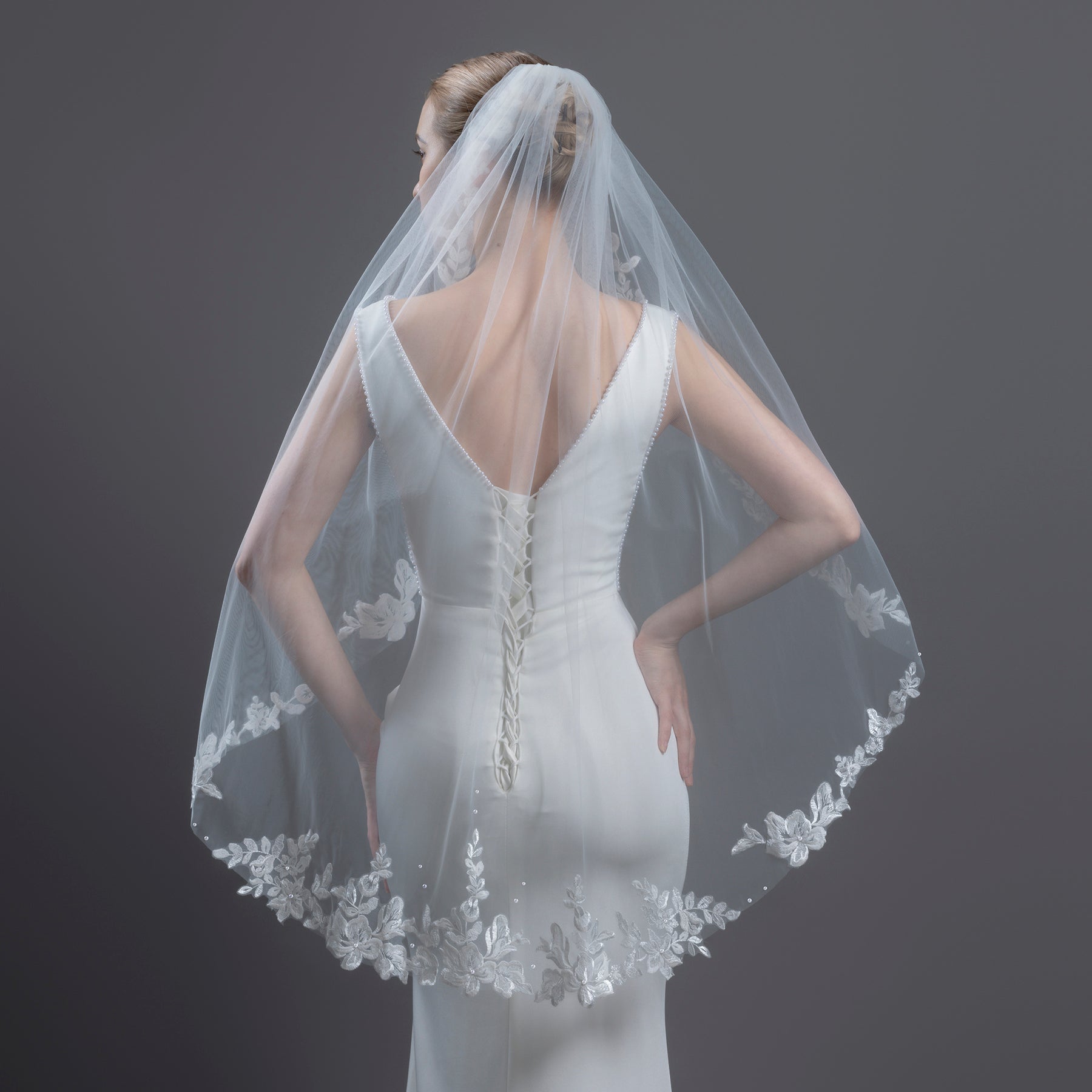 Source this exquisite lace bridal veil adorned with pearls for your boutique. This popular 42" bridal veil is crafted from delicate illusion tulle and features romantic floral vine embroidery. As a one-tier wedding veil with a 72" width, it creates a beautifully refined silhouette. An essential wholesale wedding veil piece, it includes a comfortable tulle-wrapped metal comb.