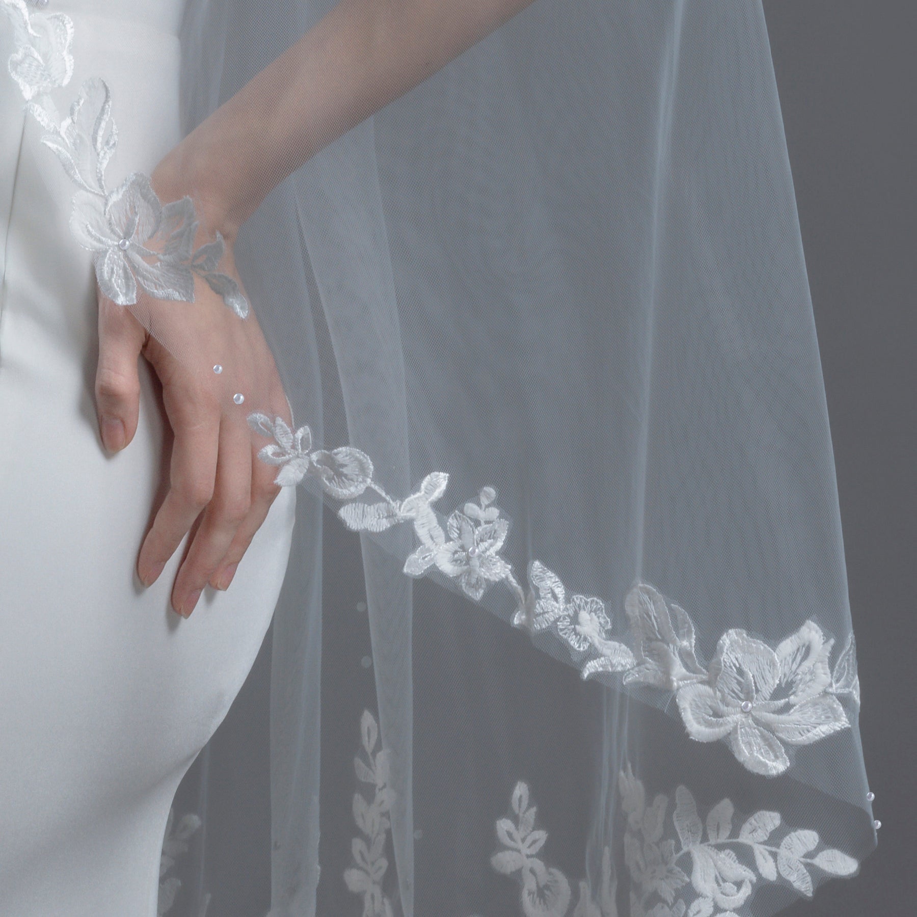 - One tier, fine illusion tulle - Floral vine embroidered lace with Pearls - 42" Fingertip or Knee length - 72" width for a refined and elegant drape - Premium flexible tulle wrapped metal wire comb