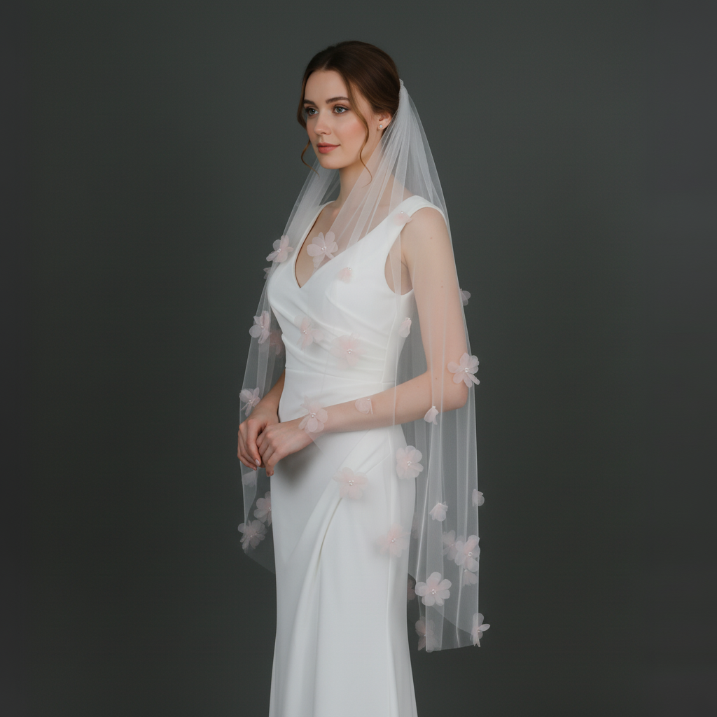 Pink Organza 3D Flower Wedding Veil with Faux Pearls, Fingertip Length