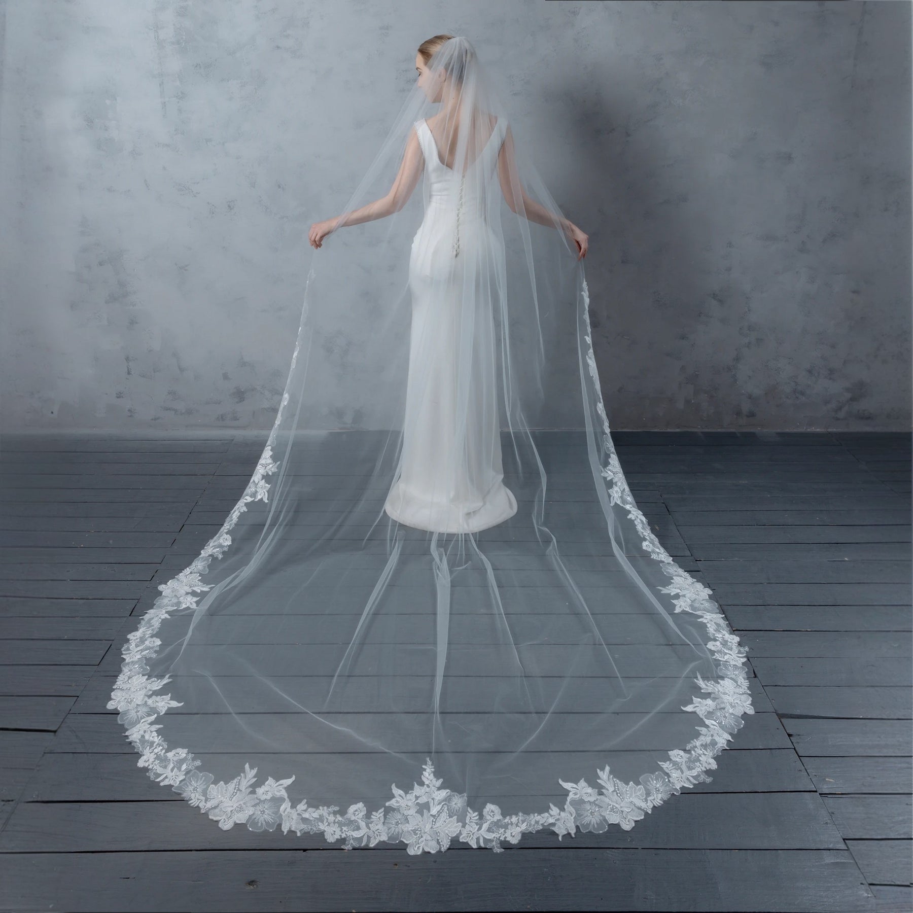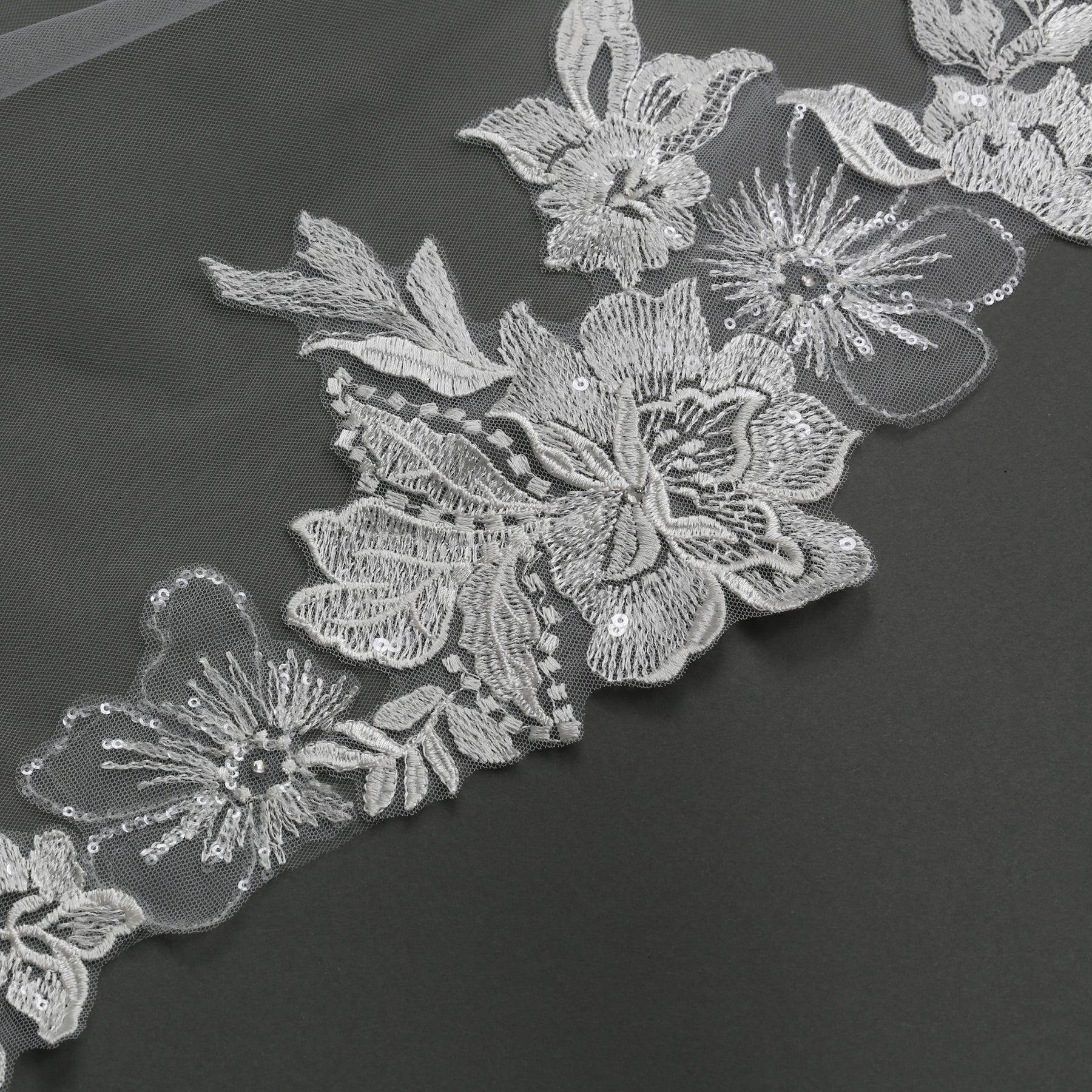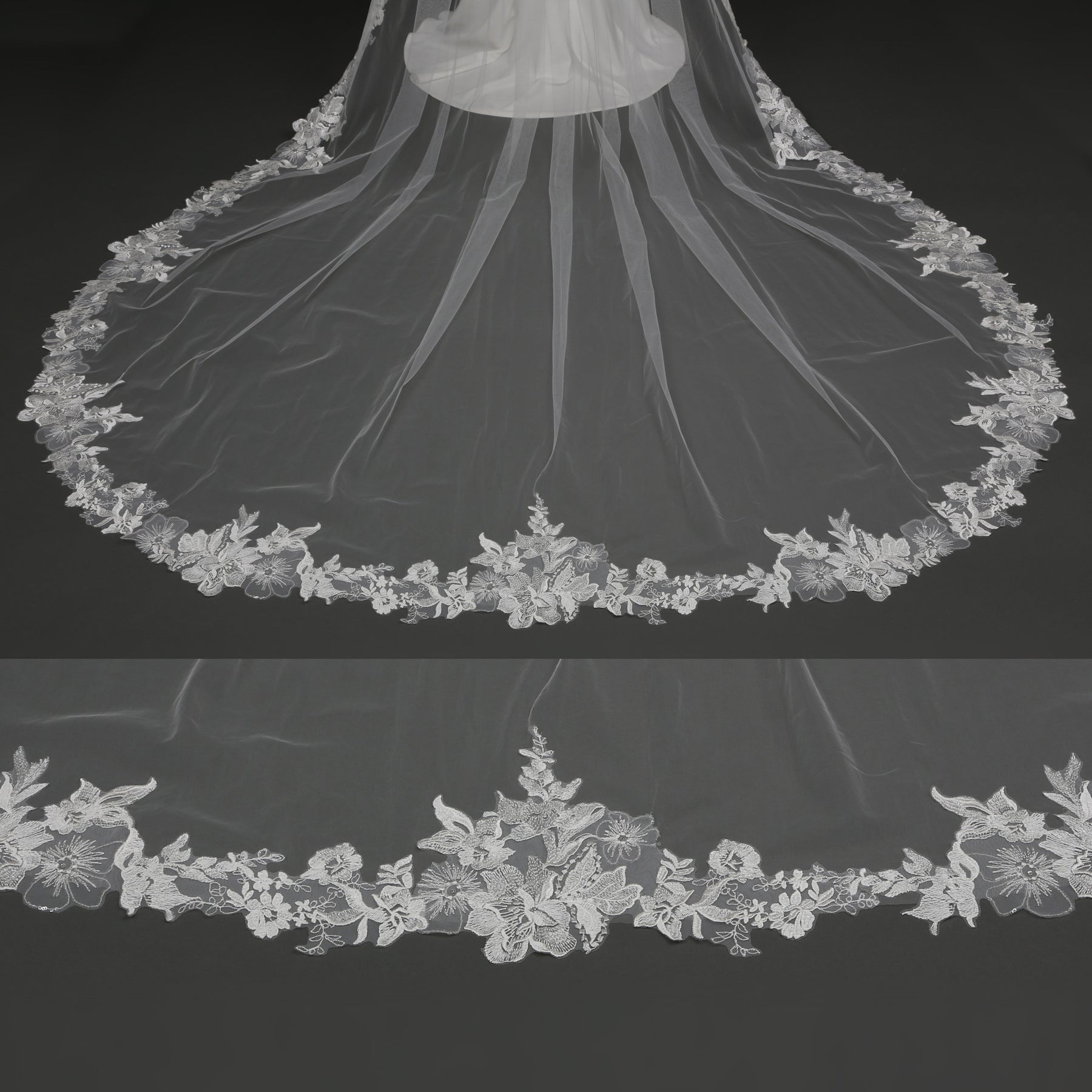 - One tier, fine illusion tulle - Embroidered floral vine lace with rhinestone and sequin decoration - Cathedral length 108"X72" or 120"X90" - Premium flexible tulle wrapped metal wire comb