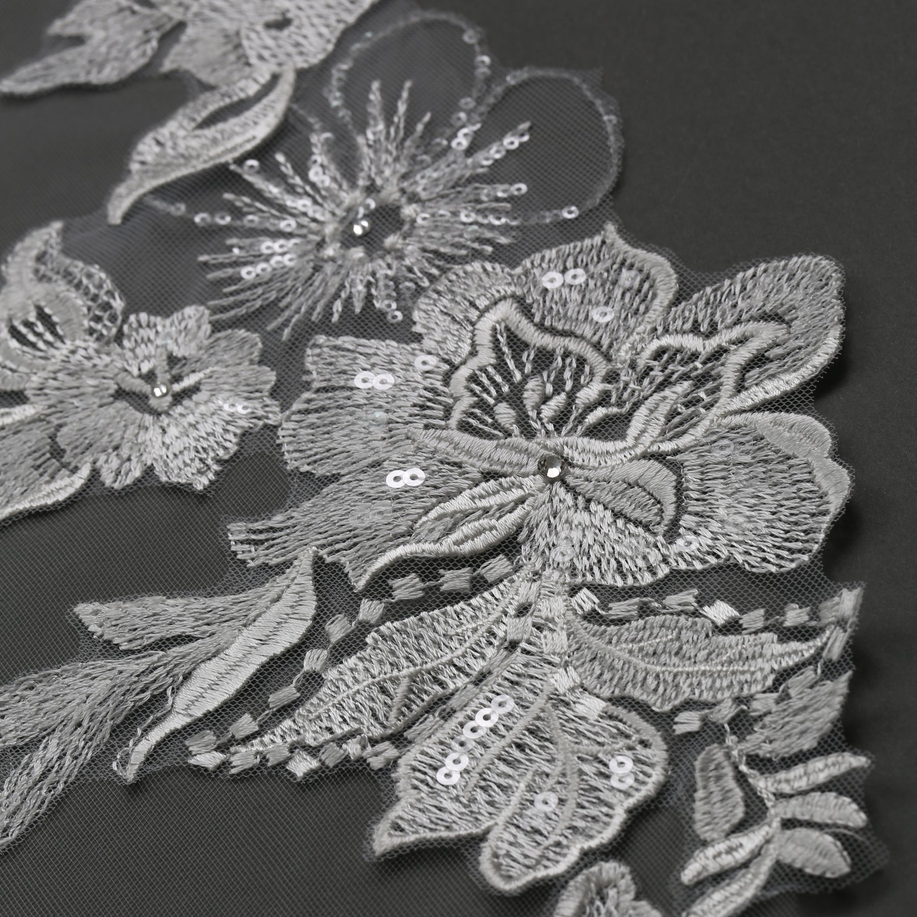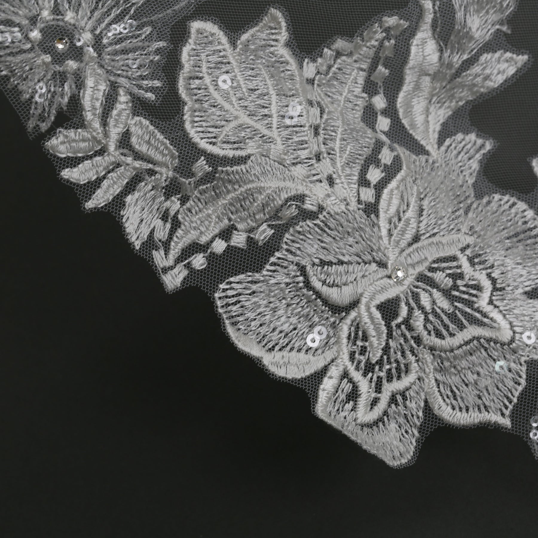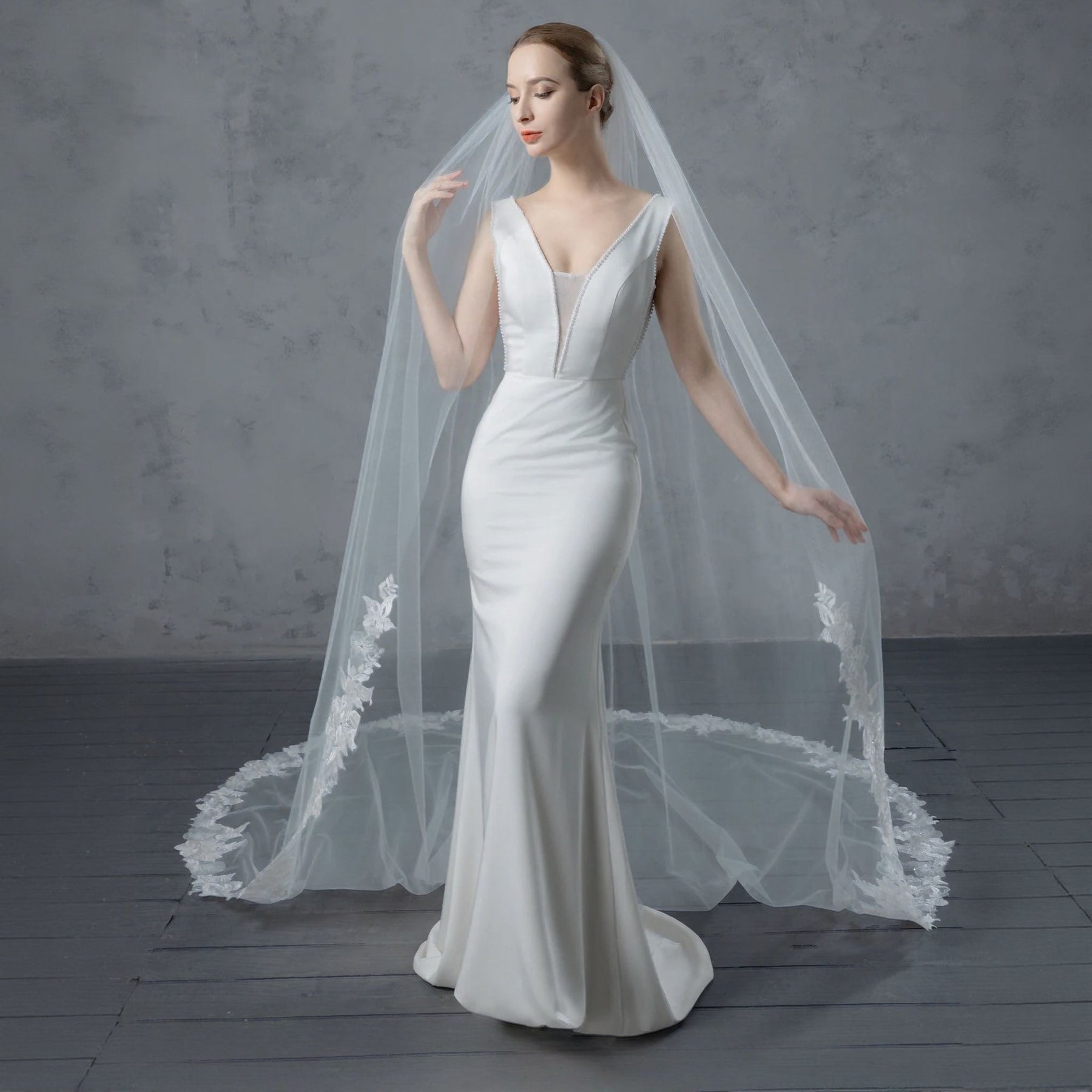 - One tier, fine illusion tulle - Embroidered floral vine lace with rhinestone and sequin decoration - Cathedral length 108"X72" or 120"X90" - Premium flexible tulle wrapped metal wire comb