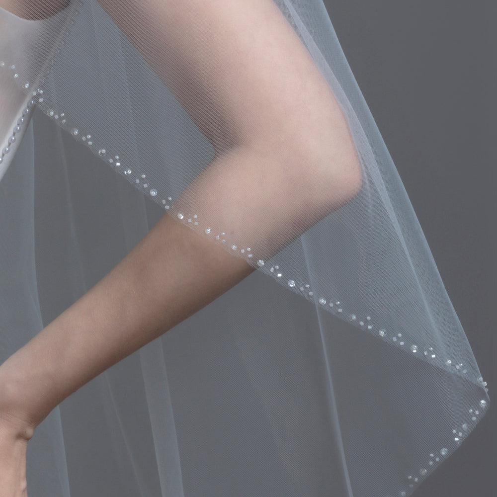 Simple Beaded Edge Bridal Veil with Pearlescent Accents, Fine Illusion Tulle, Elbow, Fingertip Length FS6390